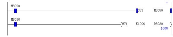 0-10V电压模拟量输出的例子: 置位M8080后直接赋值1000给D8080把万用表的红表笔接在DA0端,黑表笔接在GND,此时就会有10V的电压输出。